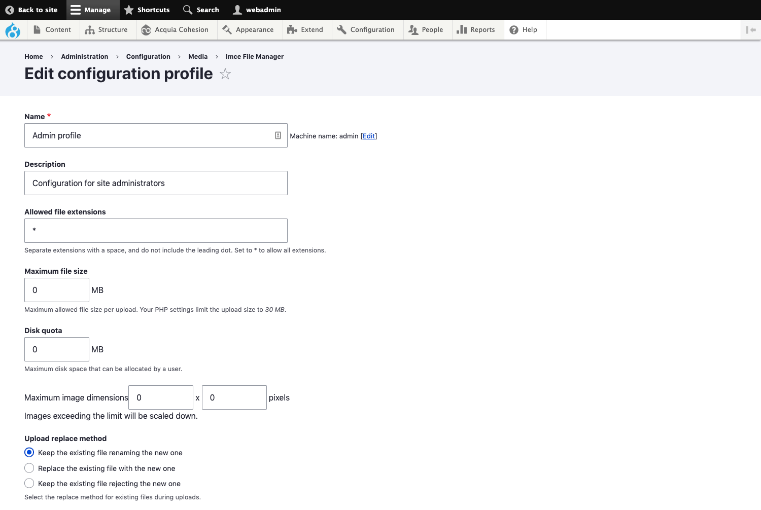 If IMCE is selected, it will handle the upload of images through Site Studio elements. Global settings, including file extensions, file size and user role access to folders are set within an IMCE profile.