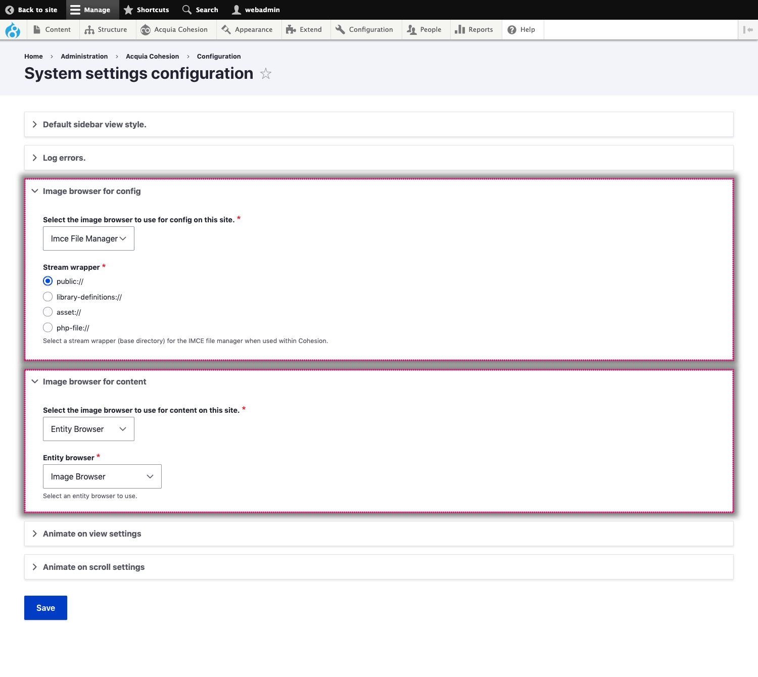 - Select which media browser to use for configuration entities and content entities. The options shown depend on the media browser modules enabled.